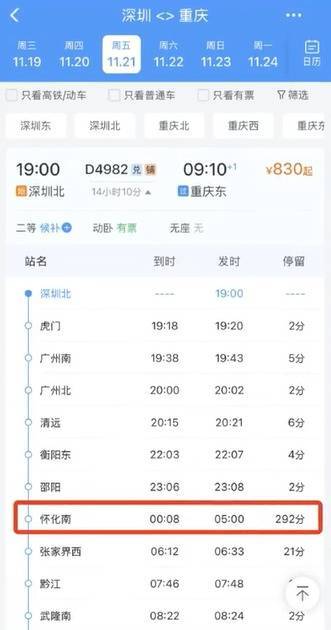 以11月21日的D4982次列车为例,其到达怀化南站的时间预计为次日00:08,而发车时间为5:00,停留时长预计为292分钟,近5个小时。