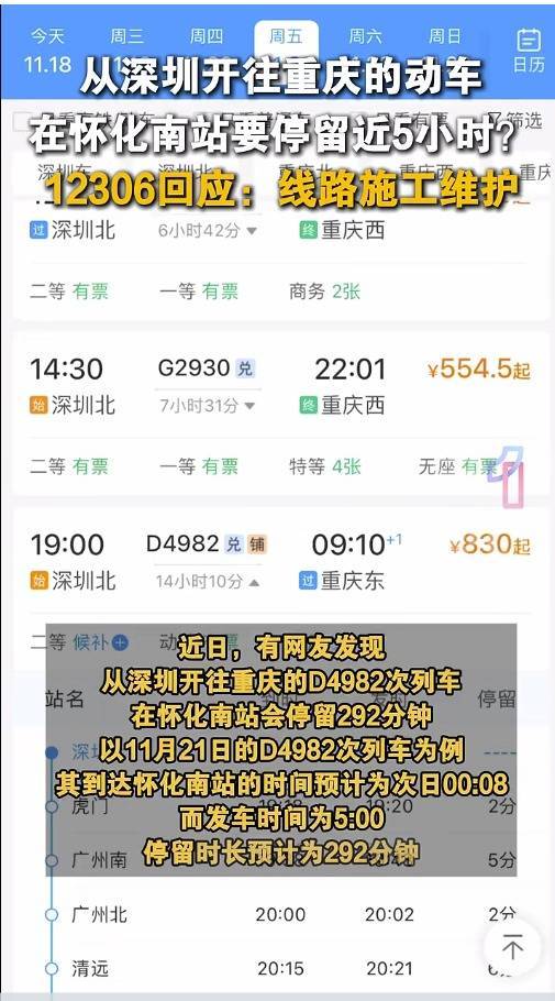 此前据大象新闻报道:近日,有网友发现从深圳开往重庆的D4982次列车在怀化南站会停留292分钟。