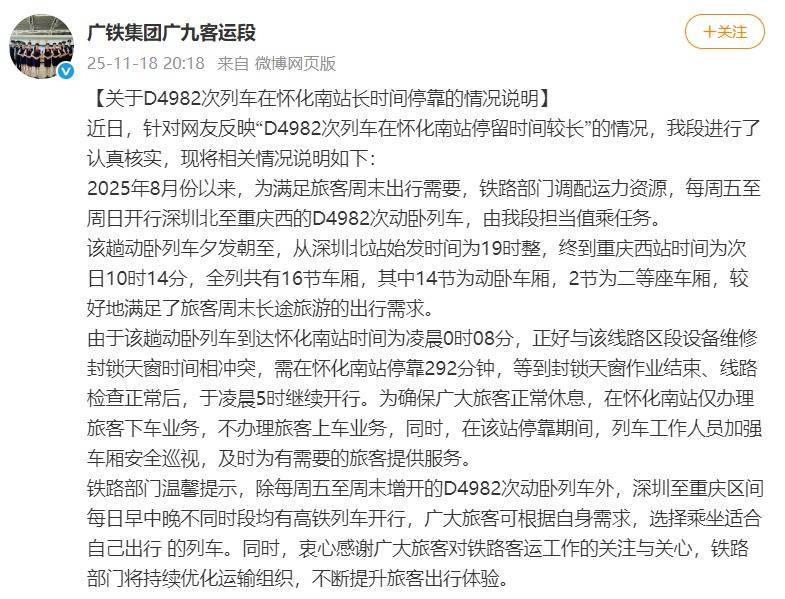 11月18日晚,广铁集团广九客运段发布《关于D4982次列车在怀化南站长时间停靠的情况说明》。